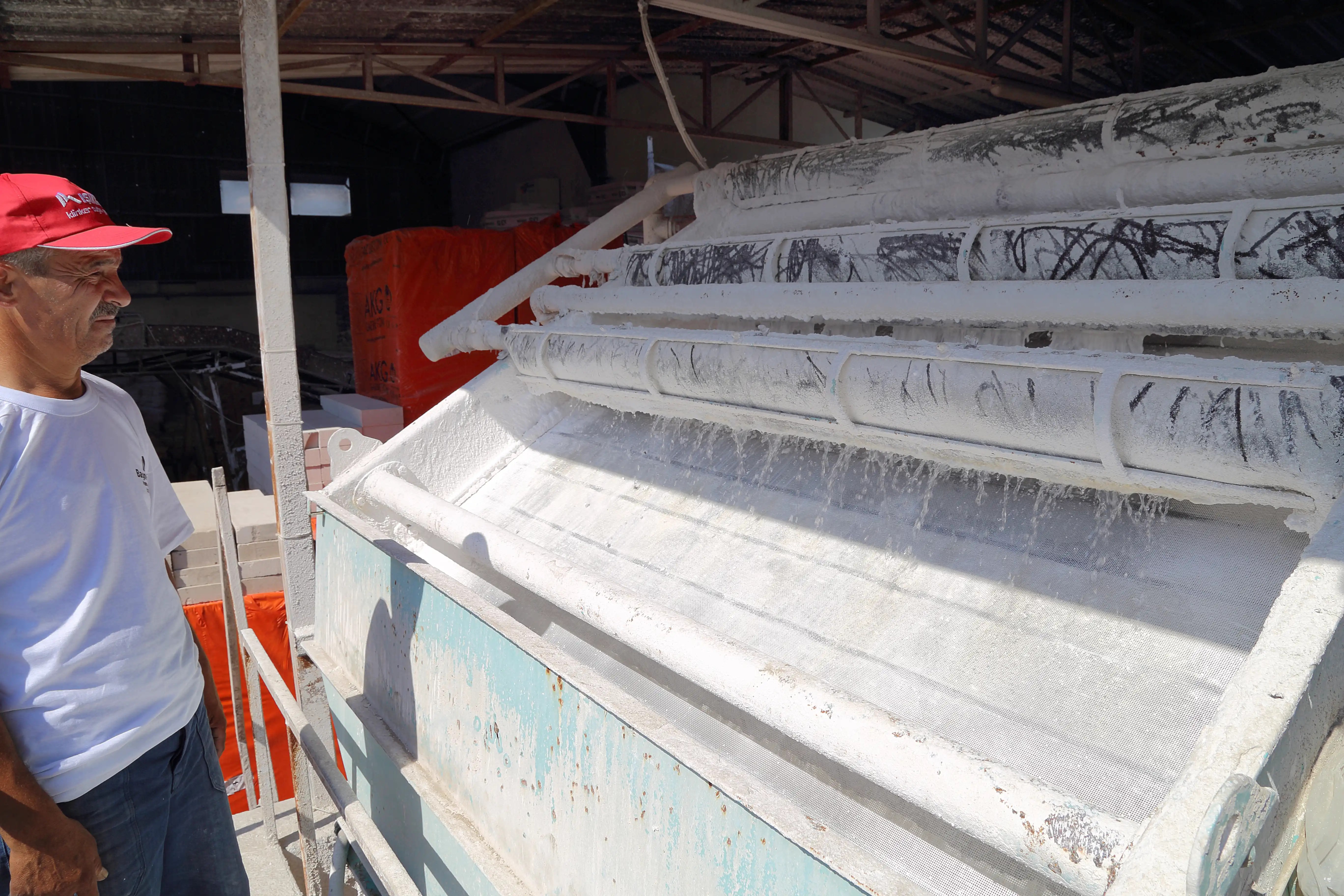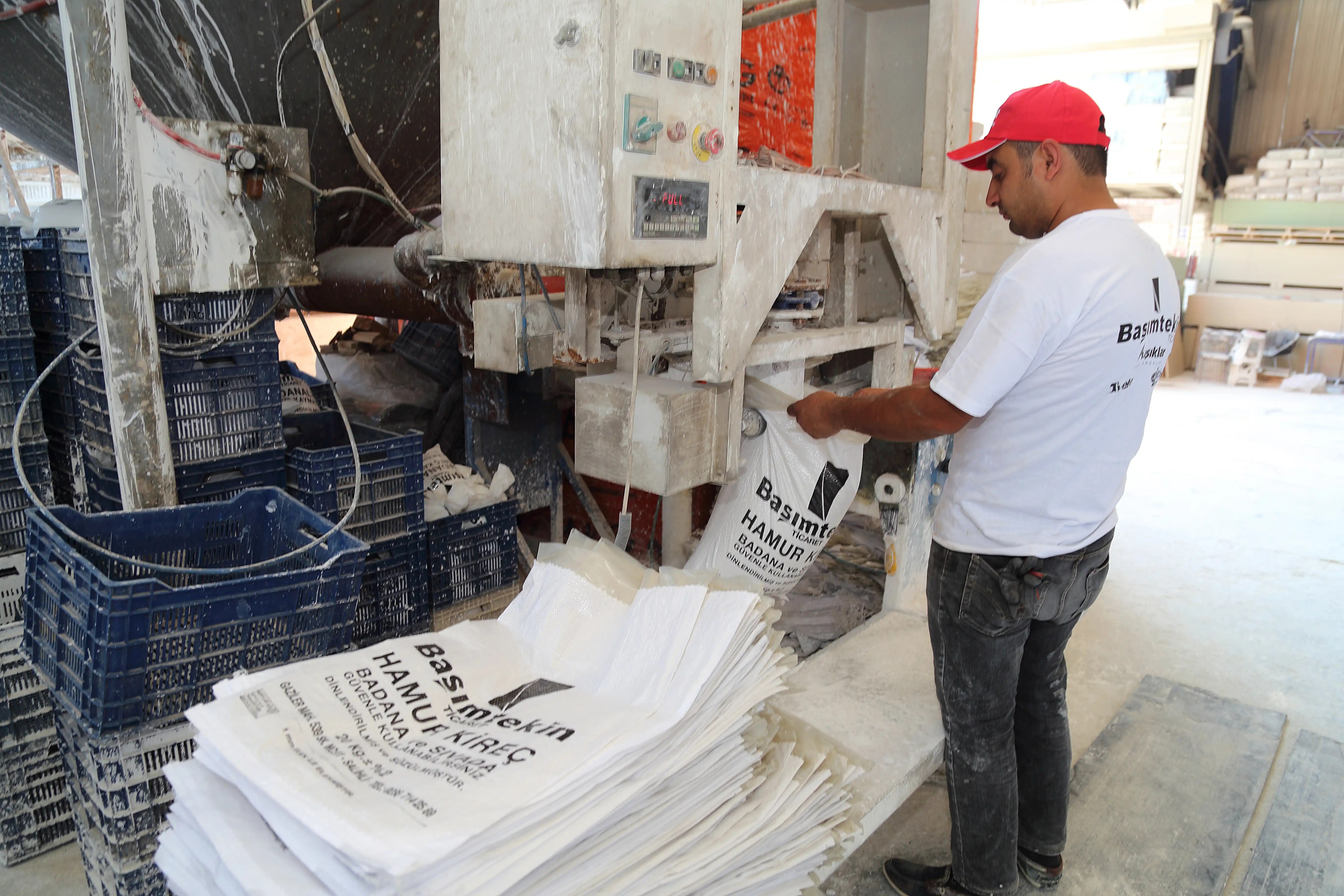 Paketleme hattında çalışan personel, hamur kireci dikkatli bir şekilde torbalara doldurarak sevkiyata hazır hale getirir.